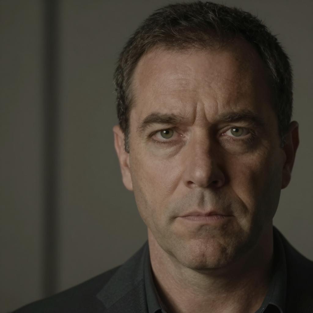 A middle-aged man with short dark hair, fair skin, and green eyes. He has a serious expression, slightly furrowed brows, and is wearing a dark collared shirt. The background is dimly lit with a dark vertical line on the left. His face is in the right half of the frame, and his eyes are centered. The lighting highlights his face while casting shadows.