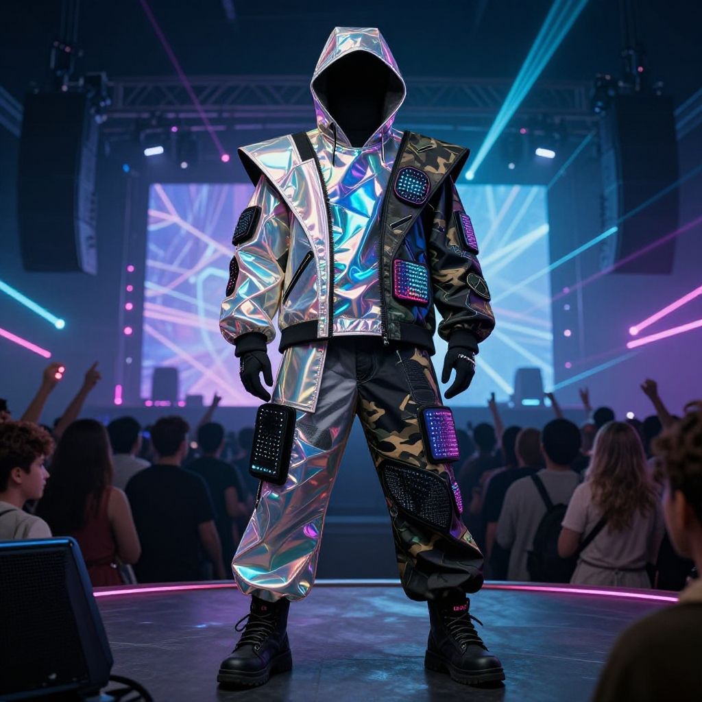 Photograph of a performer on stage wearing a shiny, metallic silver hooded jacket with a black, featureless face mask. The jacket has neon blue and pink accents and is paired with camouflage pants featuring black, yellow, and purple patches. The performer stands in the center, wearing black boots and black gloves, against a backdrop of vibrant, colorful stage lights in pink, blue, and white. The audience is visible in the foreground, with raised hands and blurred silhouettes. The stage has a dark, reflective floor and is surrounded by bright, neon lights. The overall atmosphere is energetic and futuristic.