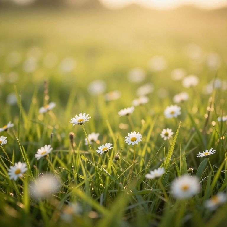 A serene meadow bathed in the soft glow of golden-hour sunlight, where daisies dance among lush green grass, and the interplay of light and shadow creates a tranquil, almost ethereal atmosphere reminiscent of impressionist landscapes.