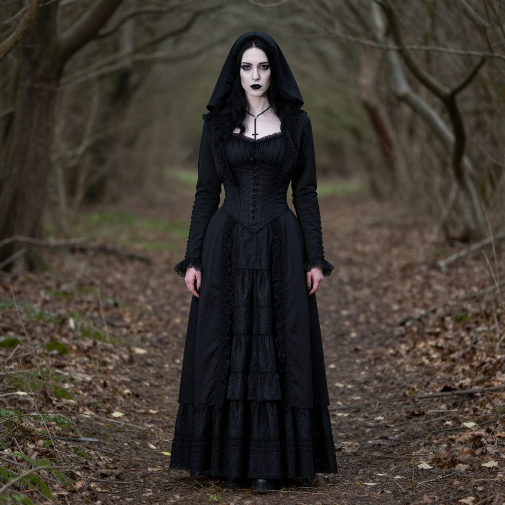 Photograph of a pale, gothic woman with black hair and dark lipstick, wearing a long, black, Victorian-style dress, standing on a forest