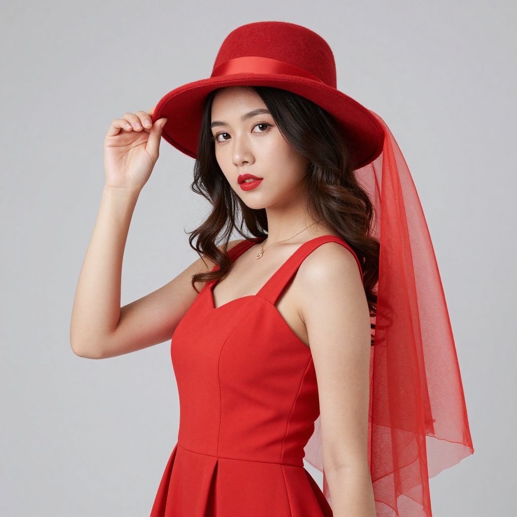 Photograph of an Asian woman with fair skin and long, wavy black hair. She wears a vibrant red, sleeveless dress with a fitted bodice and a flared skirt. Her striking red wide-brimmed hat, adorned with a sheer red veil, contrasts with her bold red lipstick. She holds the hat's brim with her right hand, gazing directly at the camera with a confident expression. The background is a plain, light gray, making her red outfit and accessories the focal point. She wears a delicate gold necklace. The image has a bright, high-key lighting style.