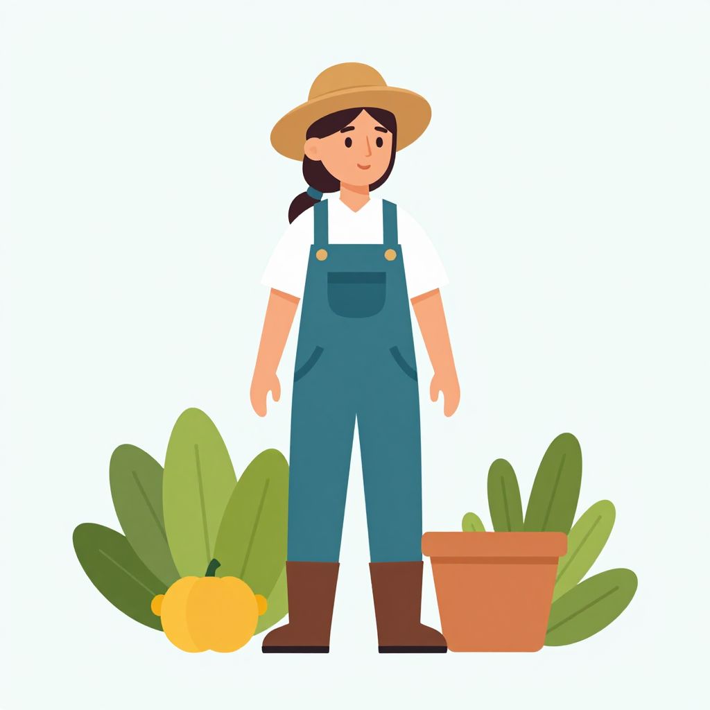 Digital illustration of a smiling Asian woman in blue overalls, white shirt, brown boots, and straw hat, standing with a potted plant and green