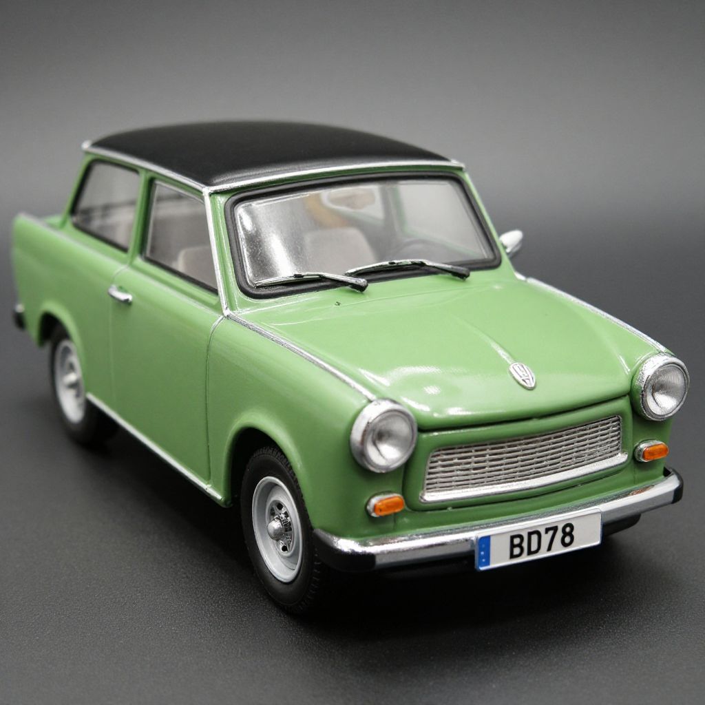 Photograph of a small, detailed, red vintage muscle car model with shiny chrome accents and silver wheels, viewed from the back on a dark gray textured