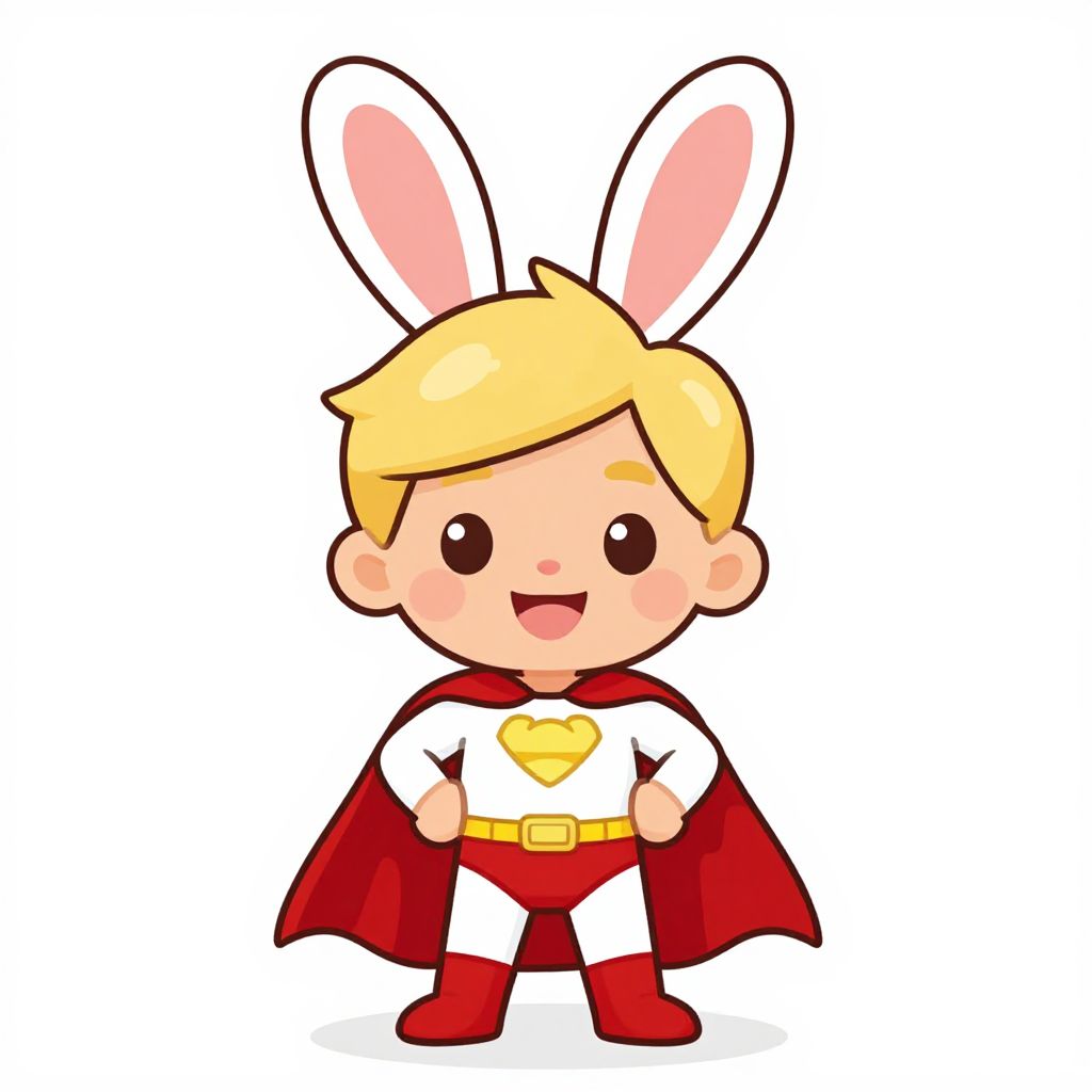 Cartoon chibi-style drawing of a blonde boy superhero with white bunny ears, red cape, white shirt with yellow heart, red pants, and red