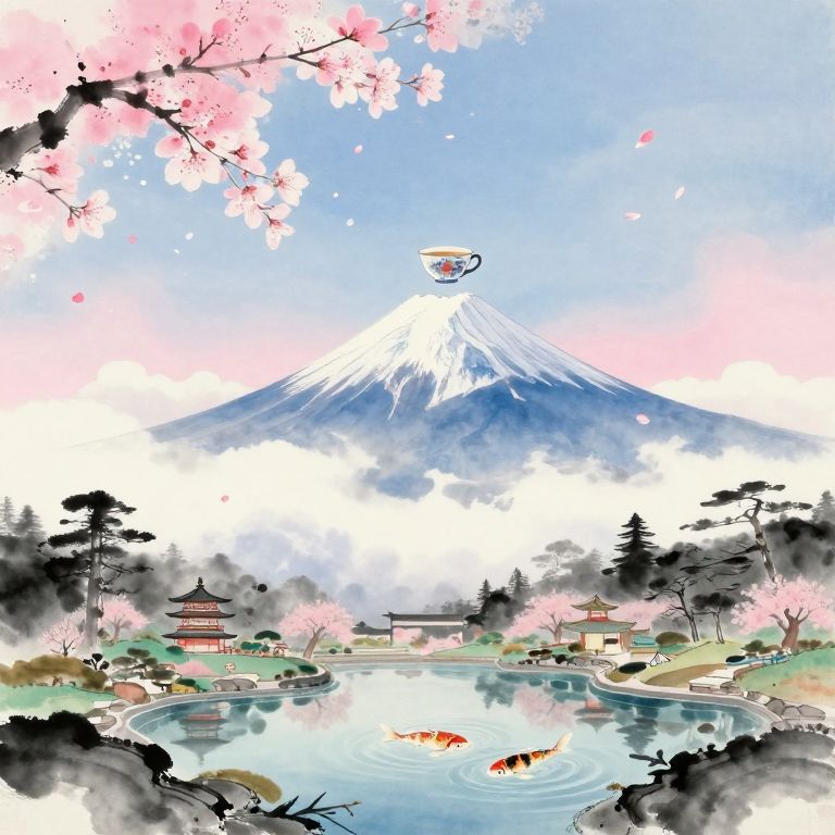 Envision an enchanting blend of dreamlike landscapes with traditional Japanese ink wash painting techniques, showcasing a delicate balance of a floating teacup perched on the summit of Mt. Fuji as viewed from above the clouds. The expansive sky is painted with fluid brushstrokes that transform into dancing cherry blossom petals carried by a gentle breeze. Below the mountain, a serene Japanese garden comes alive with geometrically precise koi fish gliding gracefully beneath the surface, creating ripples that mirror the soft shapes of the floating teacup above. This evocative scene harmoniously combines surreal elements with tranquil beauty, inviting viewers on an emotional journey through ethereal landscapes.