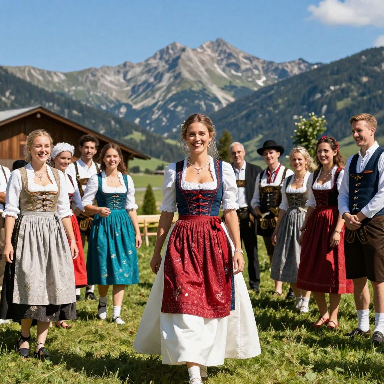Photograph of a group of smiling people in traditional Bavarian attire, standing in a grassy field with mountainous background, clear blue sky, and