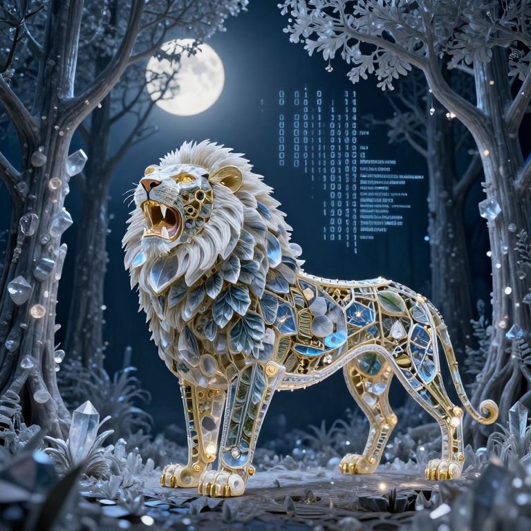 A botanical clockwork lion roars in binary code from a forest of crystalline trees that hum harmonic frequencies beneath moonlight.