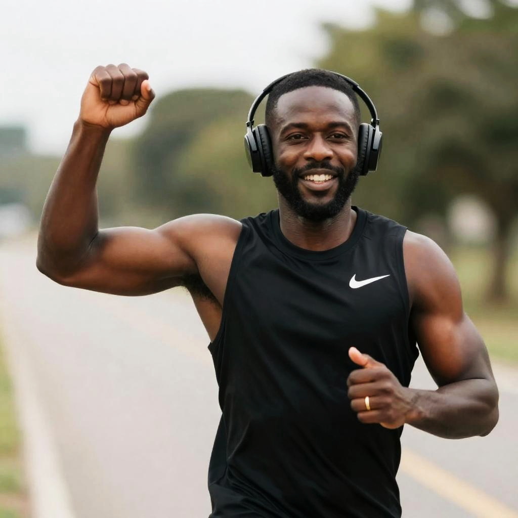 Muscular black man with beard, wearing black sleeveless Nike shirt and headphones, runs on paved path. Right arm raised, left hand on chest. Smiling, intense expression. Blurred green trees and sky background. Right hand wears gold ring.