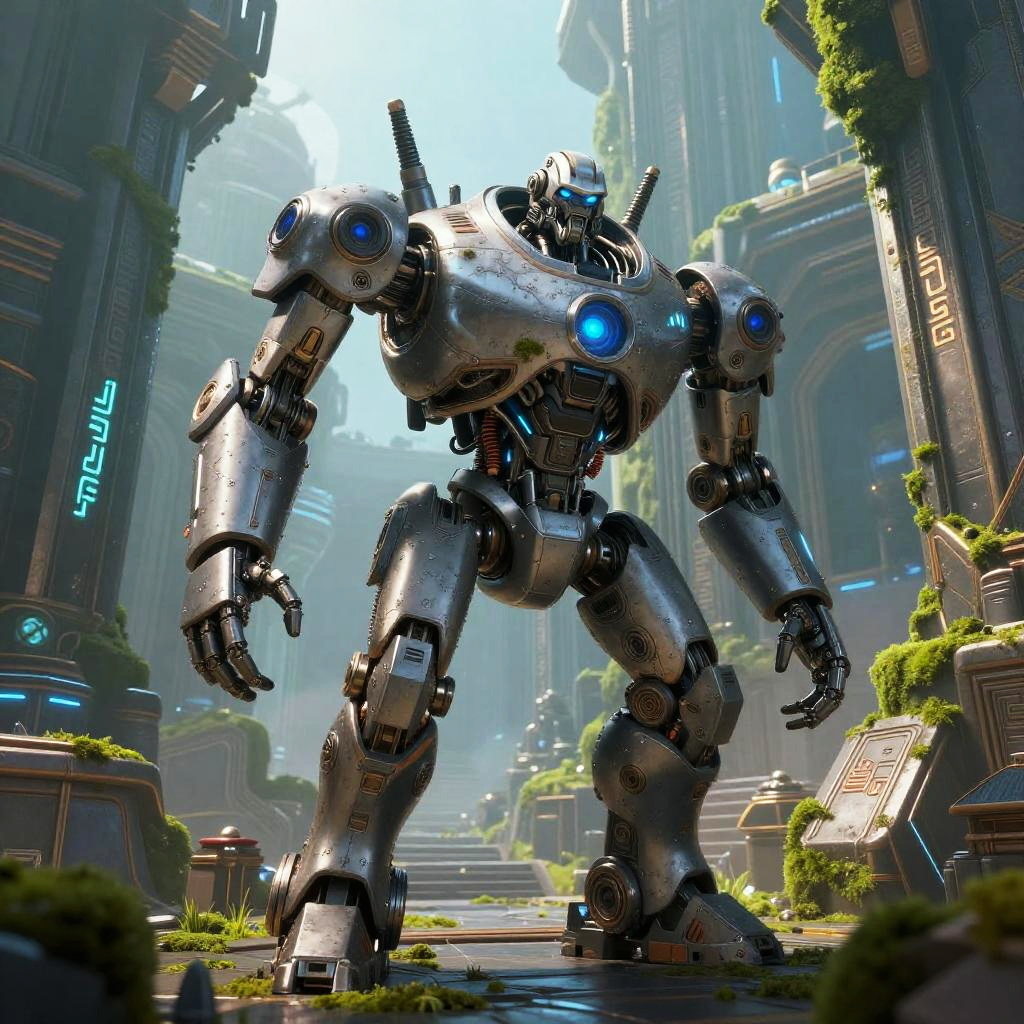 Ratchet and Clank robot exploring an ancient robotic temple, moss-covered metal ruins with glowing runes, mysterious atmosphere with fog and soft blue lighting, a fusion of advanced technology and ancient architecture, intricate robot design with worn textures