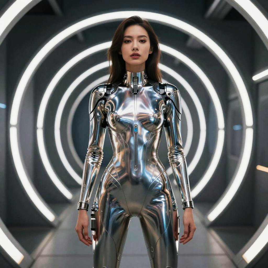 A confident woman stands in a futuristic tunnel illuminated by concentric white light rings, wearing a reflective, metallic high-tech bodysuit with intricate panel detailing. The image showcases a sleek sci-fi aesthetic with high contrast and glossy surfaces, emphasizing modernity and advanced technology.