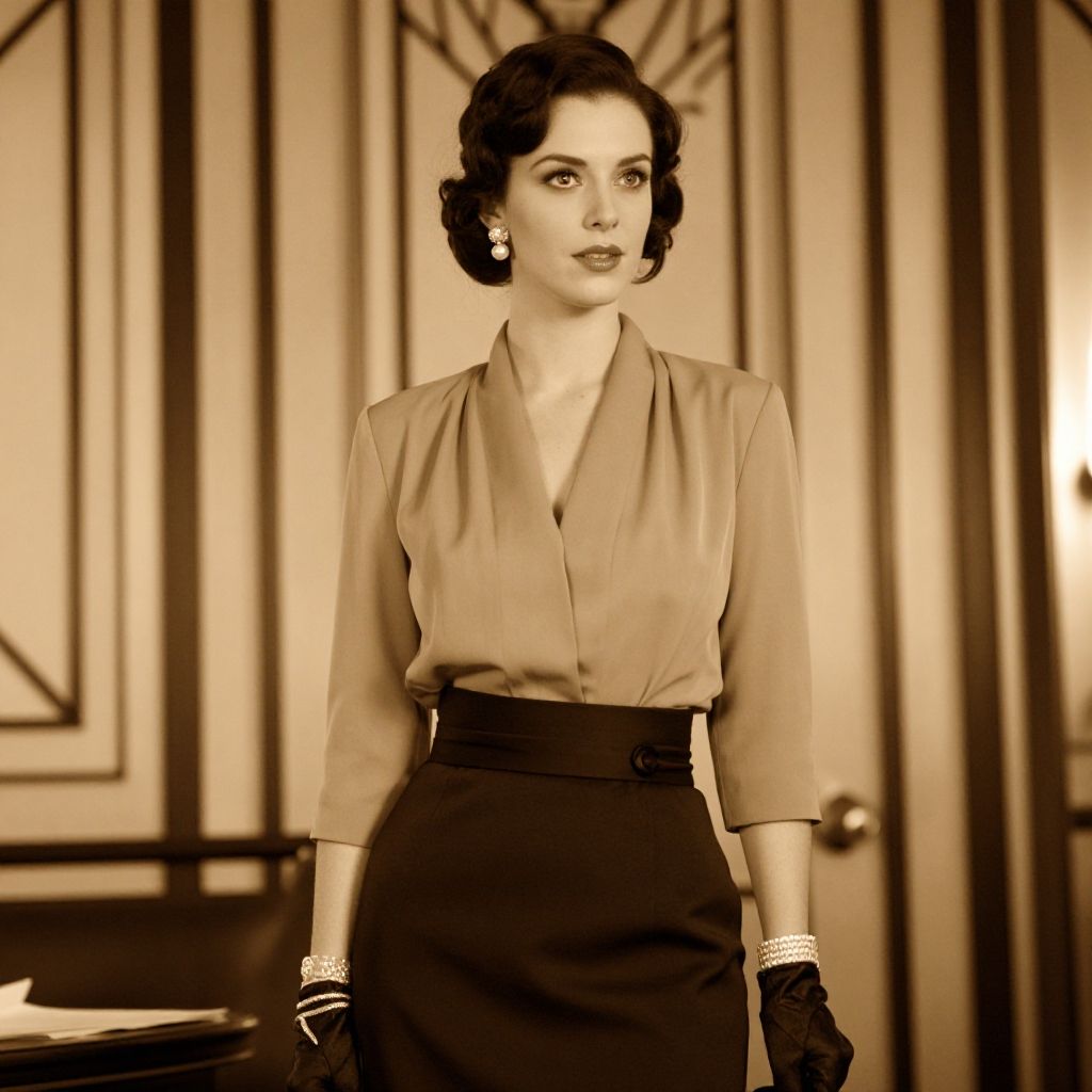 Photograph of a white woman with wavy dark brown hair, styled in vintage 1940s fashion. She wears a light blue satin blouse with a ruffled front and black high-waisted skirt. Her makeup is classic with red lipstick. She stands centered against a beige, ornately paneled wall with geometric patterns, softly lit from the front. The image has a warm, vintage filter, highlighting the textures and colors of her clothing and the background. Her expression is serious and composed, with a slight tilt to her head.