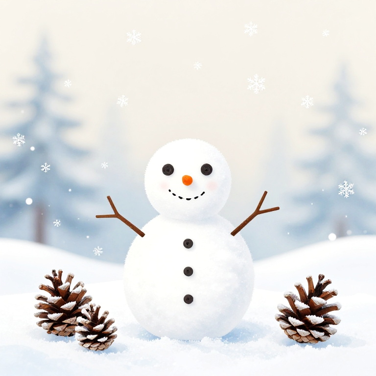 Cute winter aesthetic wallpaper of a minimalist snowman with button eyes and a carrot nose, surrounded by delicate snowflakes and frosted pinecones, soft focus background in warm beige and icy blue shades, combining simplicity and cozy winter vibes in a modern style.