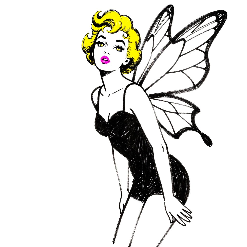 Realistic photo.A sketched fairy at a quarter angle in comic style with pop art elements. Black and white with vibrant accents like pink lips, glinting eyes, and yellow hair, in the style of an outlined surrealist 1950s illustration. Art deco and minimalist influences, with a vintage yet colorful feel. realistic photo
