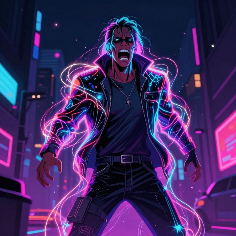 Corporate Espionage character in cyberpunk clothing, fear agony scared, magic glowing swirling multicolor light threads surround their whole body. Night, street, illustration style, neon colors,