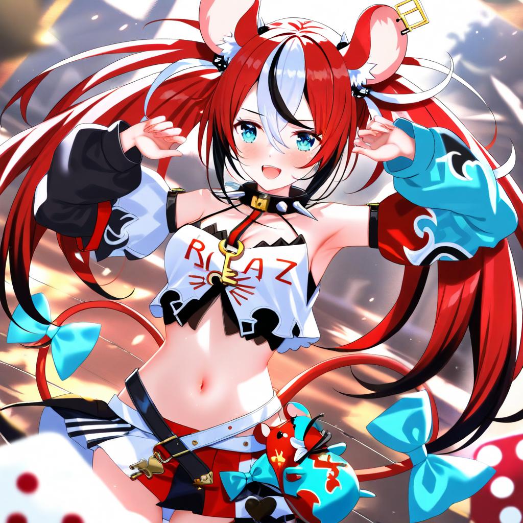 Mr. squeaks (hakos baelz), hololive, 1girl, mouse girl, mouse ears, mouse tail, animal ear fluff, sharp teeth, tail bow, blue eyes, hair between eyes, red hair, streaked hair, black hair, white hair, long hair, dice hair ornament, twintails, medium breasts, navel, white shirt, spiked collar, bare shoulders, detached sleeves, virtual youtuber, virtual youtuber, mouse (animal), midriff, key, by artist swordsouls, animagine