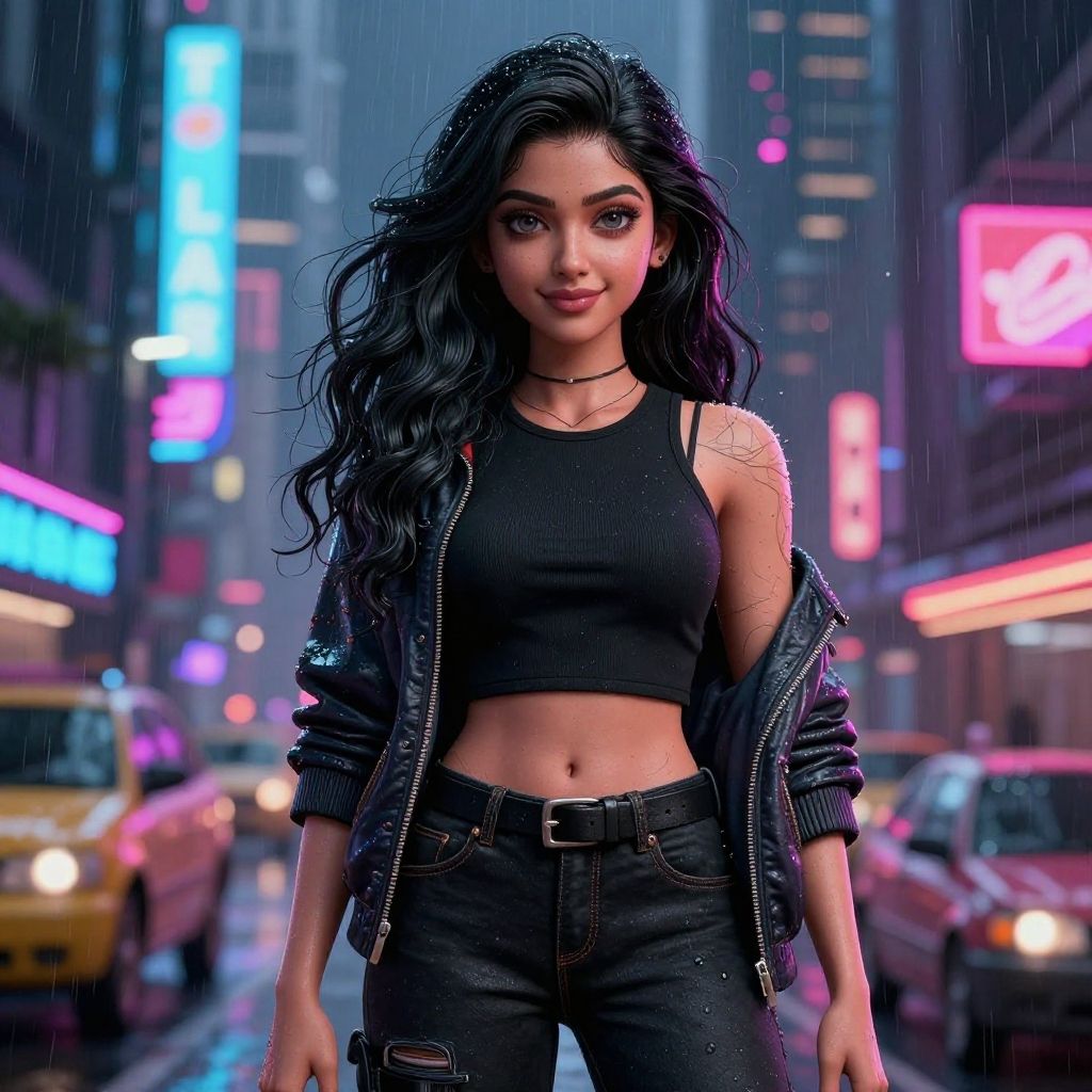 Digital artwork of a confident young woman with long black hair, wearing a black crop top, jacket, and jeans, standing in a rainy, neon-l