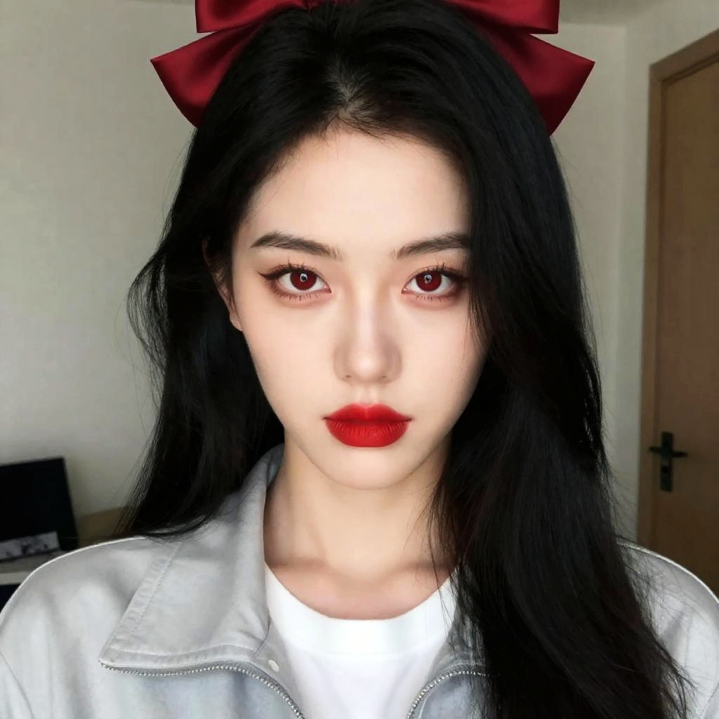 Photograph of a pale-skinned woman with long black hair, red eye makeup, red lipstick, and a red bow in her hair. She wears a light gray jacket over a white shirt. Blurred indoor background. Intense facial expression.