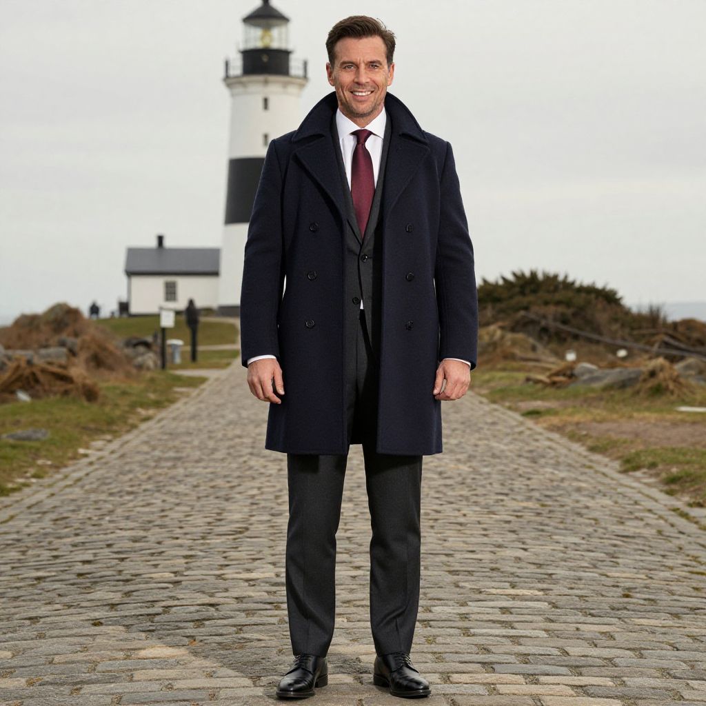 A man, navy wool peacoat, tailored charcoal suit, crisp white dress shirt, silk tie in deep burgundy, polished black leather oxford shoes, historic lighthouse, cobblestone pathways, cinecolor, confident expression, warm smile. Man has masculine face and piercing eyes