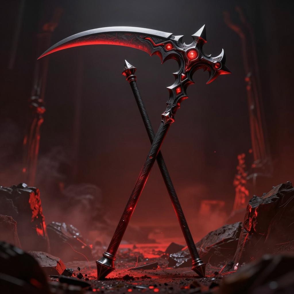 Tonal Values a dual bladed magical scythe made from black steel and tinged in red, ethereal atmosphere landscape, dramatic lighting, unreal engine, rim lighting, 8k, highly detailed, hyper realistic, cinematic lighting, dark magic, ultra detailed, texture detail, cinematic, 80mm, photography, style of league of legends, Arcane, photorealistic, hdr, upbeta,