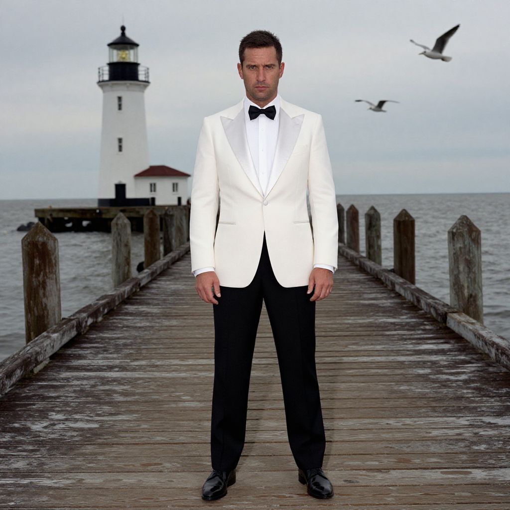 Photograph of a handsome man in a dark suit, red tie, and brown vest standing on grass by a calm sea with two boats in the background