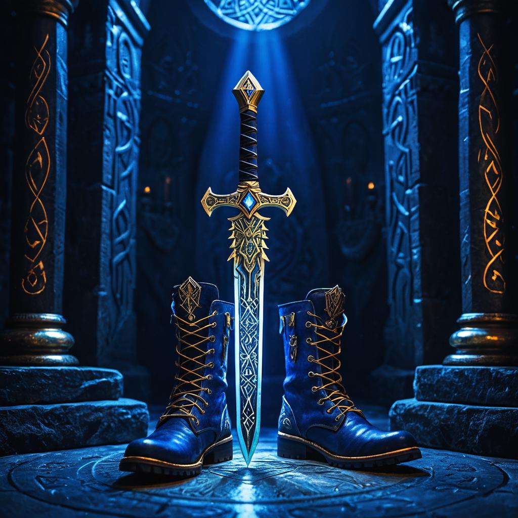 Illustration of luminous runic dagger, styled in a ancient occult chamber. The boots feature intricate detailing, magical illumination, and an ethereal glow, with backgrounds of glowing indigo and gold. The design conveys fantastical elegance and whimsical ambiance in ultra-detailed 4K resolution.