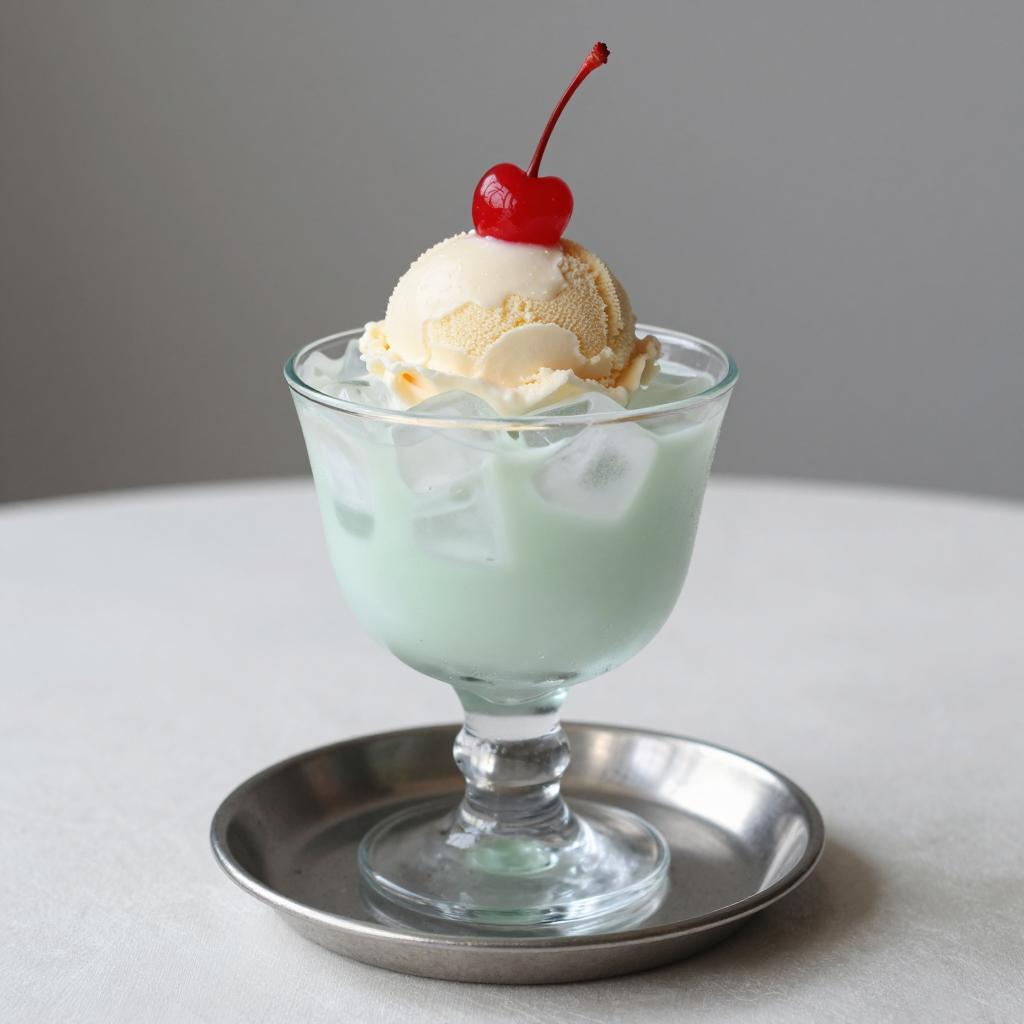 Glass goblet with frosted blue-purple exterior, filled with ice and a scoop of vanilla ice cream topped with a red cherry. On a dark wooden table, there are a note with blue ink, a blue pen, a small vial, a wooden chest with dried flowers, and a white lamp with a translucent shade.