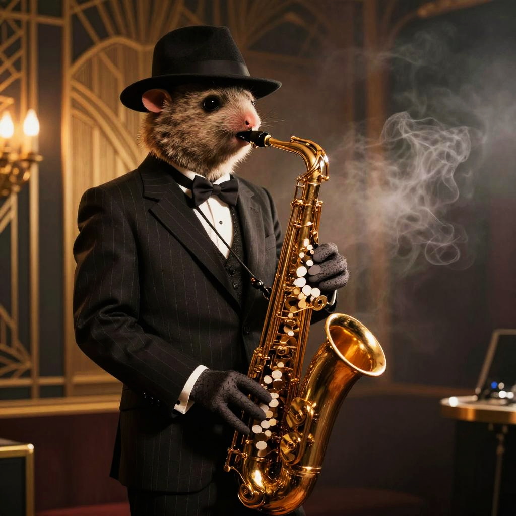 Rat wearing clothes dressed as an elegant 1920s jazz musician, with a pinstripe suit and fedora, playing a miniature saxophone on a smoky stage, art deco background, warm moody lighting, highly detailed textures of fabric and fur