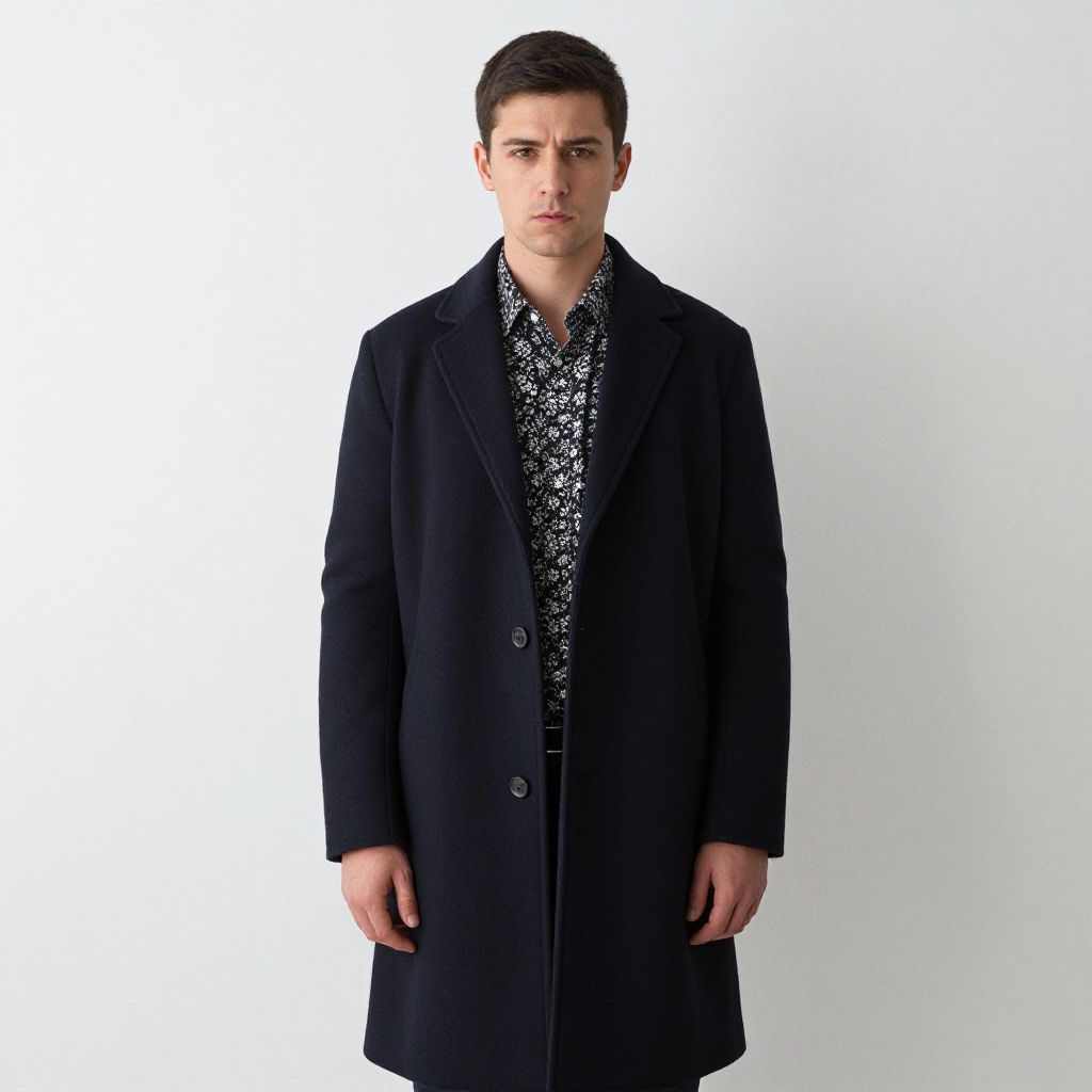 A photograph of a serious-looking man standing against a plain white wall. He has short, dark hair and is wearing a long, dark navy overcoat over a black and white floral shirt. His hands are by his sides and he's looking straight at the camera. The overcoat reaches down to his knees, contrasting with the simple background.