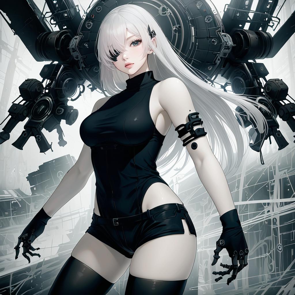 Digital anime-style drawing of a pale-skinned, white-haired woman with a sleek, black, high-neck bodysuit and black shorts. She has a slender, curvy figure with medium-sized breasts, and wears black gloves and thigh-high stockings. Her right arm has a black armband. She stands confidently with a slightly parted mouth and intense green eyes. Behind her are large, abstract, black mechanical structures resembling guns or machinery. The background is a monochromatic grayscale with geometric patterns, giving a futuristic, cyberpunk feel. The overall style is sharp and detailed, with a strong contrast between black and white elements.