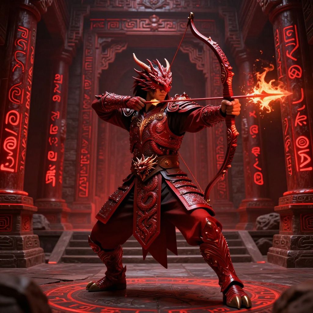 Red dragon ranger in ancient temple ruins covered in glowing red runes, armor embellished with dragon-themed engravings, holding a bow with flaming arrows, poised to shoot, mysterious and powerful stance, vibrant reds contrasted with dark shadows, cinematic fantasy style.
