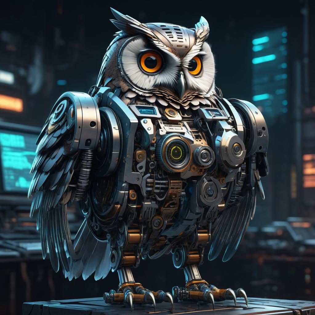 A mechanical owl styled as a cyberpunk hacker, featuring a detailed character design sheet that showcases various poses. Influenced by artists like Kim Jung Gi, this piece captures eye-catching contrasts, trending on ArtStation, rendered in 8k resolution with an ultra-wide angle, enhanced by a motion blur effect.