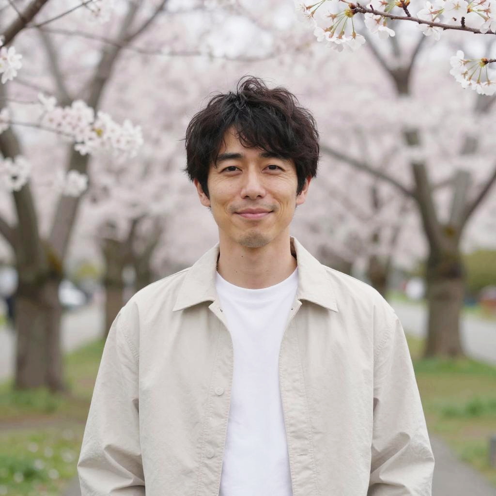Portrait of a half Japanese man with a gentle smile, wearing a minimalist modern outfit, serene garden with cherry blossoms in full bloom, soft pastel colors, depth of field focus