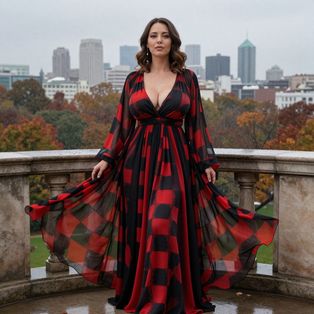 Photograph of a woman standing on a stone balcony with a cityscape and autumnal trees in the background. She has wavy brown hair and wears a long, flowing, black and red checkered dress with a deep V-neck, showcasing a moderate cleavage. The dress is sheer with long sleeves and she holds the sides out slightly. The stone balcony has a balustrade, and the sky is overcast. The city features modern skyscrapers and a mix of green and fall-colored trees. The woman's expression is neutral, and she stands confidently in the center of the image.