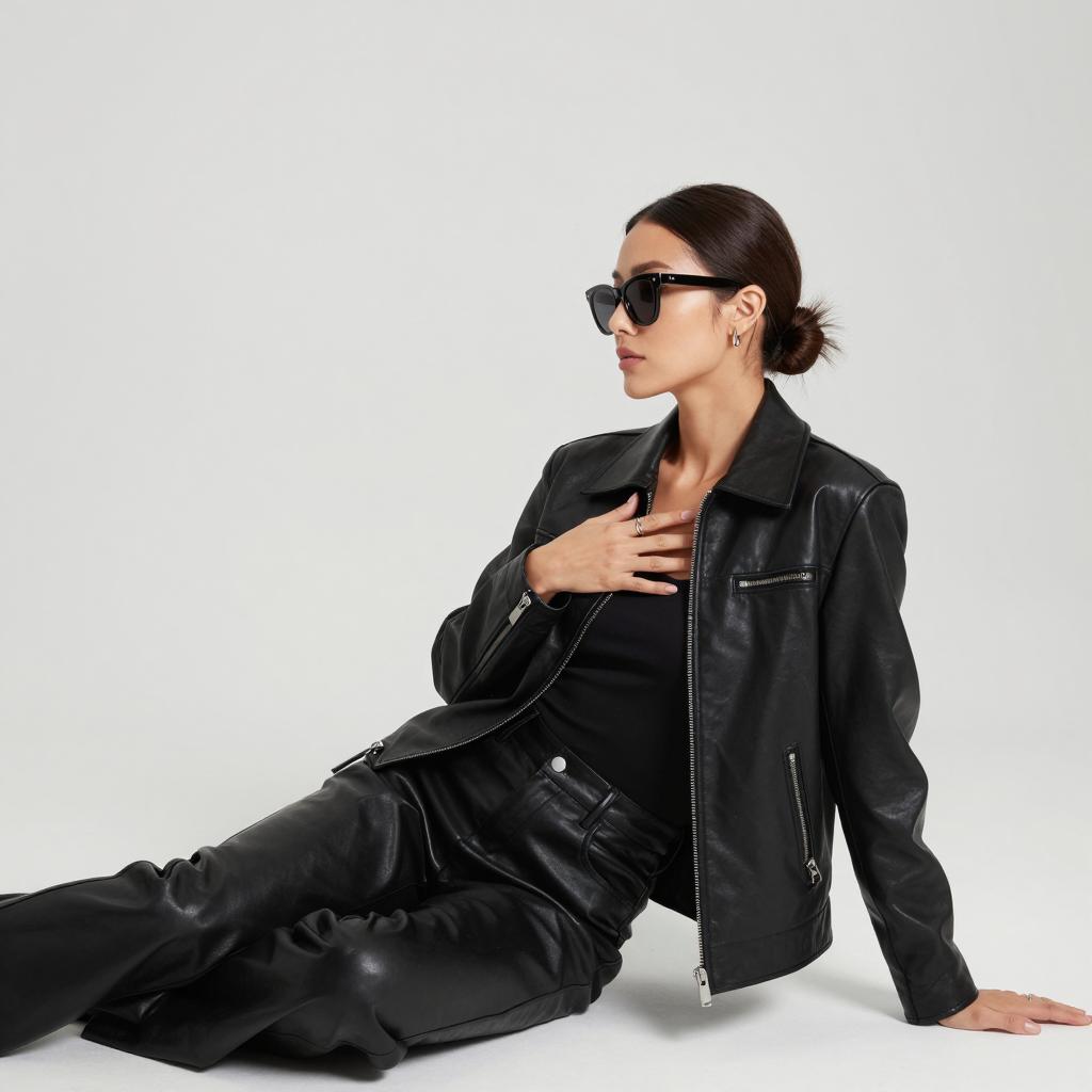 Woman in black leather jacket, long black dress with high slit, black stockings, black boots, holding black handbag with chain strap, standing against white corner wall, wearing black sunglasses, braided hair, right arm raised, left arm down, intense gaze.