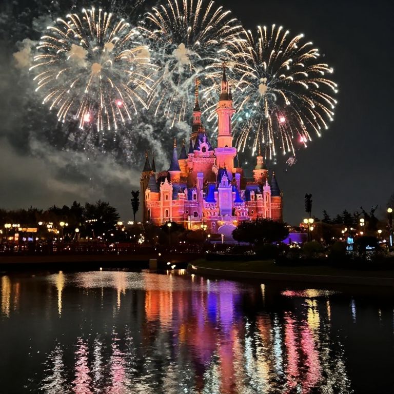The scene is further enhanced by the shimmering reflections on the water below, mirroring the vibrant colors of the fireworks and the castle's grandeur. The water's surface is calm, creating a serene and tranquil atmosphere that complements the overall mood of the image. The interplay of light, shadow, and color creates a sense of depth and perspective, drawing the viewer into the scene and inviting them to explore the intricate details of this enchanting tableau.
