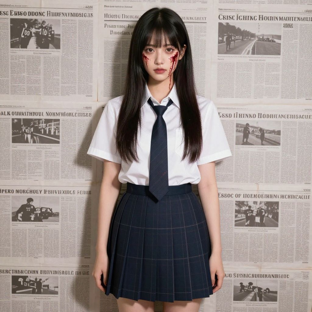 (masterpiece, top quality, best quality, official art, beautiful and aesthetic:1.2), 1girl, newspaper background, standing, blood on face, (jk_style, jk, school uniform)