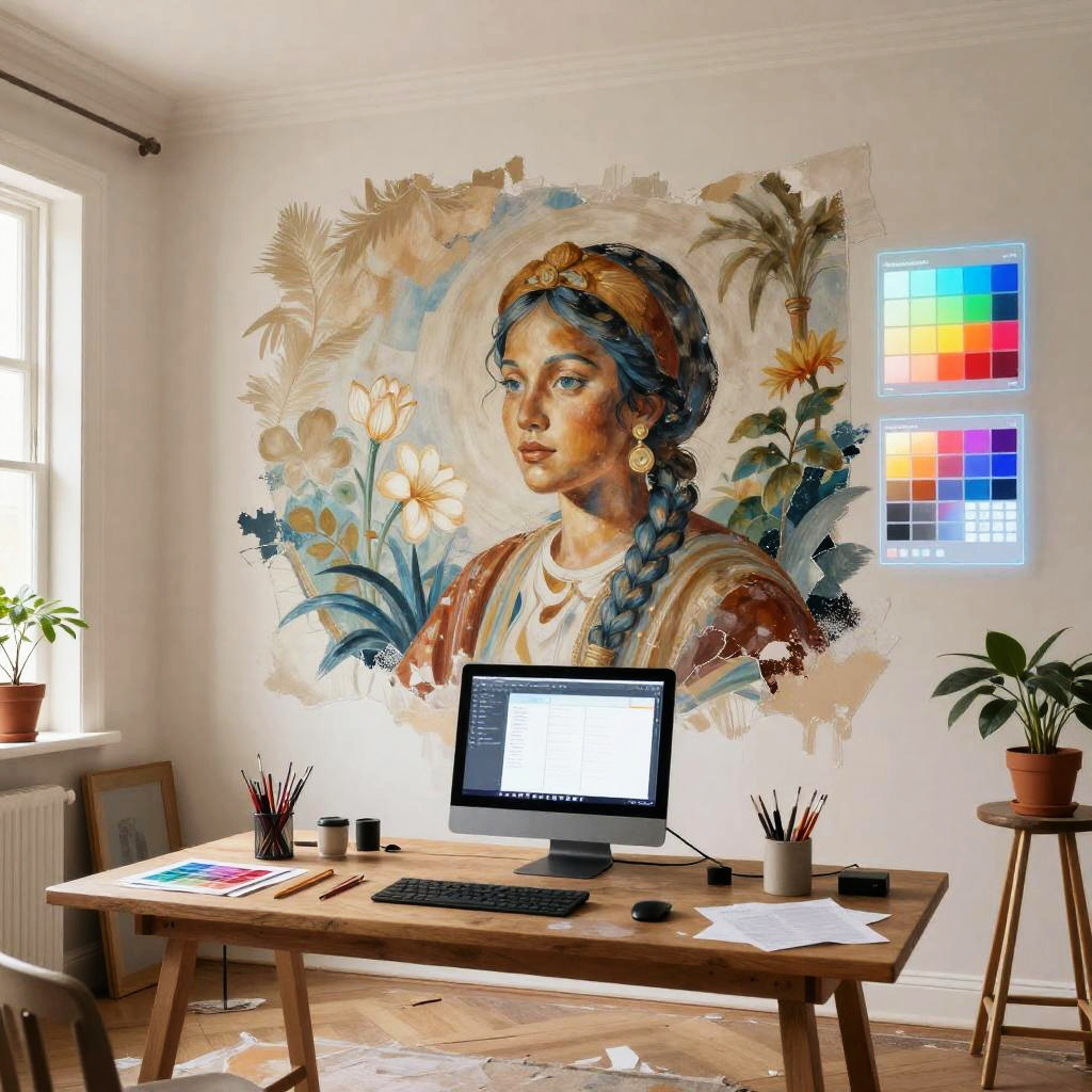 AI inpainting free tool visualized as a creative digital artist's workspace, where an old mural is seamlessly restored on a large wall, surrounded by holographic brushes and color palettes, combining technology and art in a bright, inspiring environment.