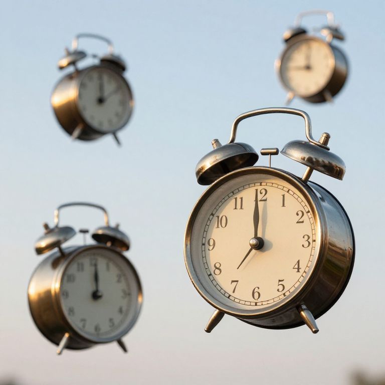 Photograph of four vintage, silver metal alarm clocks floating in mid-air against a clear blue sky. The clocks, each with black hands, numbers, and twin bells, are positioned at various distances and angles, creating a dynamic, slightly surreal effect. The closest clock is in sharp focus, showing its white face and black numerals clearly, while the others in the background are progressively blurred. The lighting highlights the metallic sheen of the clocks, casting subtle reflections and shadows. The overall composition emphasizes movement and time, with the clocks appearing as if they are falling or suspended in a dreamlike state.