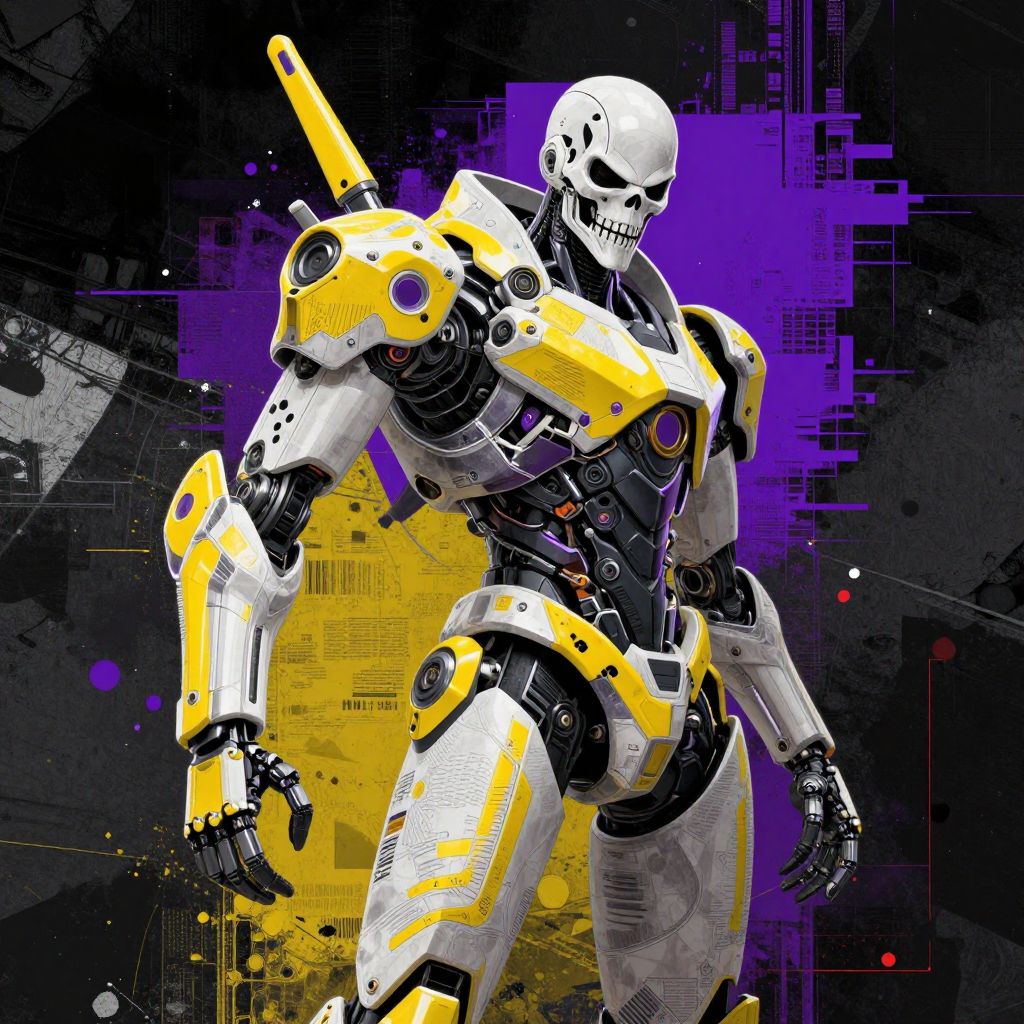 Digital artwork of a futuristic, humanoid robot with a white skull head, featuring a menacing grin. The robot is predominantly white with bright yellow armor accents on the shoulders and arms, and black circuitry visible on its chest and joints. It has a large, yellow sword protruding from its back. The background is a dark, abstract mix of black, purple, and yellow digital patterns, with geometric shapes and neon splashes, adding a cyberpunk aesthetic. The robot's pose is dynamic, with one arm raised and the other slightly lowered, exuding an aura of power and readiness.