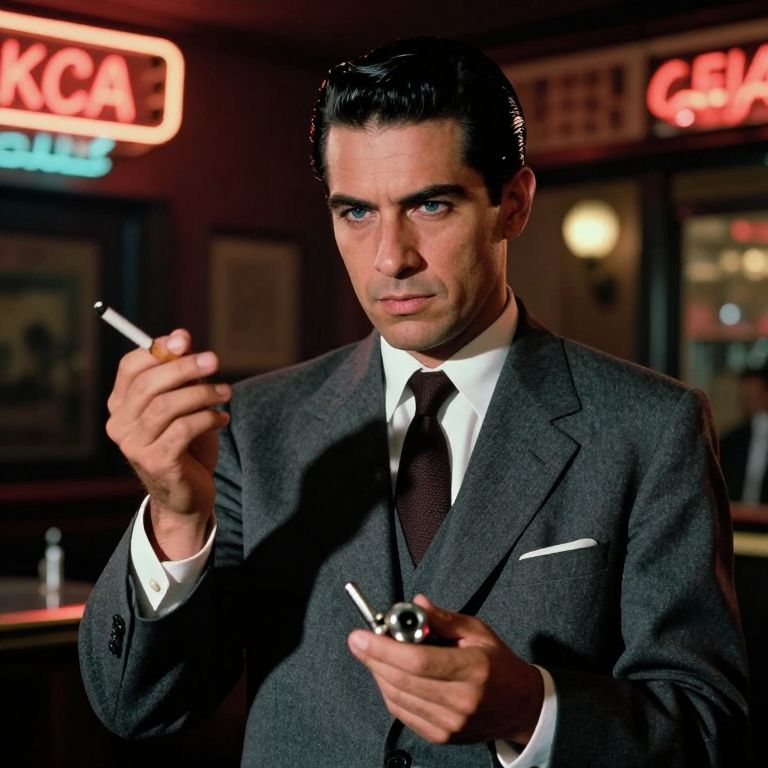 Craft a vintage film noir portrait of a Latin American magician with sharp features and distant blue eyes beneath sleek black hair parted deeply to one side. He's dressed in a tailored charcoal-gray suit, crisp white shirt, and dark tie, holding a silver cigarette holder in his left hand while his right performs an invisible sleight of hand trick. The scene is illuminated by dim neon lights from outside a run-down speakeasy bar, casting dramatic shadows across the subject's face, exuding intrigue and mystery.