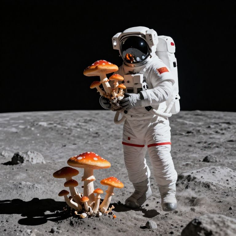 A lone astronaut, clad in a pristine spacesuit, hovers serenely in the moonlit void, cradling a whimsical garden of vibrant orange mushrooms that sprout defiantly from the rocky lunar surface, defying the barren reality of the Moon.