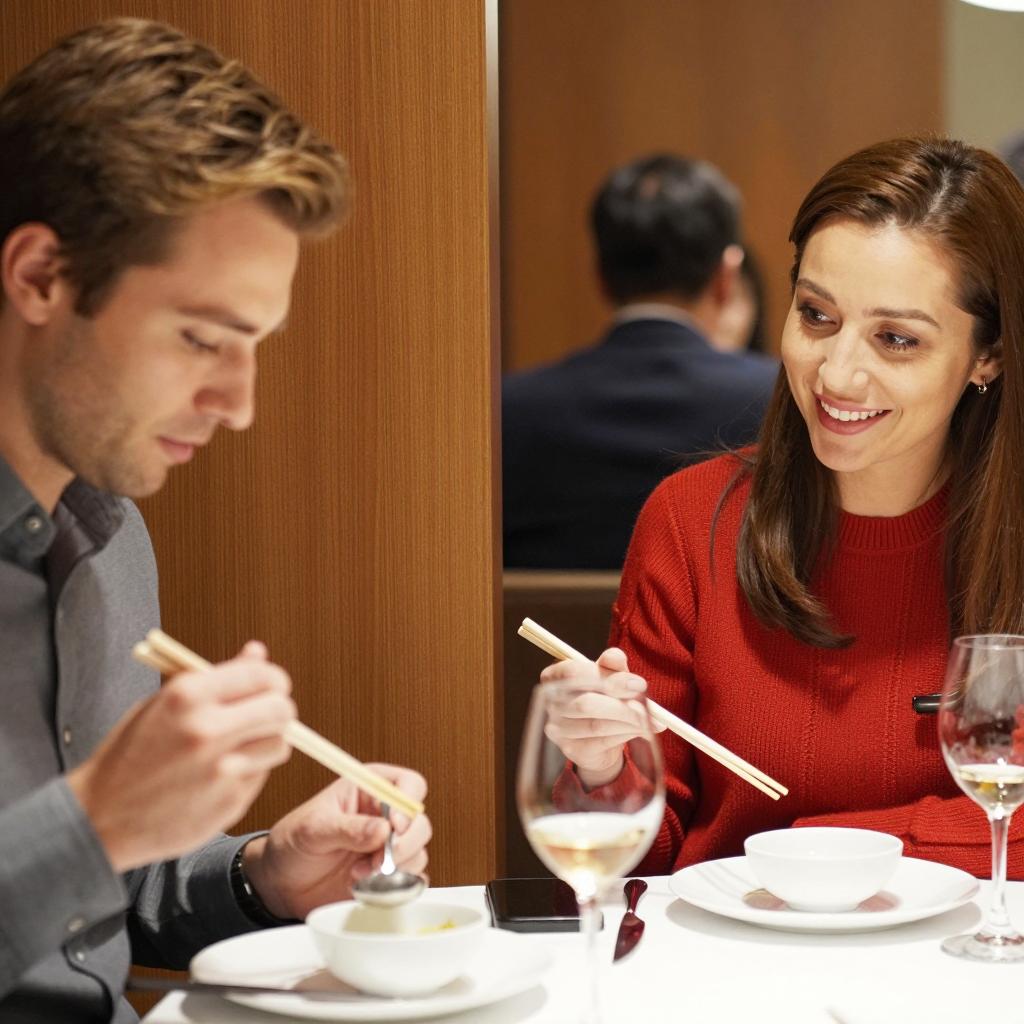 Two people dining in a restaurant. Man on left with light brown hair, gray shirt, holding chopsticks and a spoon. Woman on right with brown hair, red sweater, holding chopsticks. Wooden divider between them. Glass of wine, bowl, and glassware on table. Woman smiling. Background slightly blurred with another person. Warm lighting.