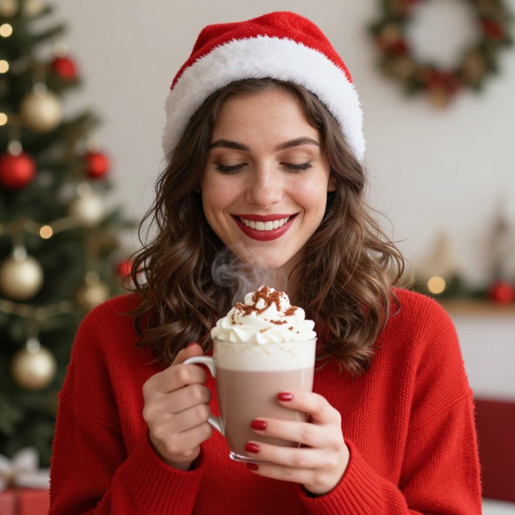 Woman bundled in festive red attire holds a steaming cup of hot beverage topped with whipped cream and cocoa powder, smiling warmly against a backdrop of holiday decorations.