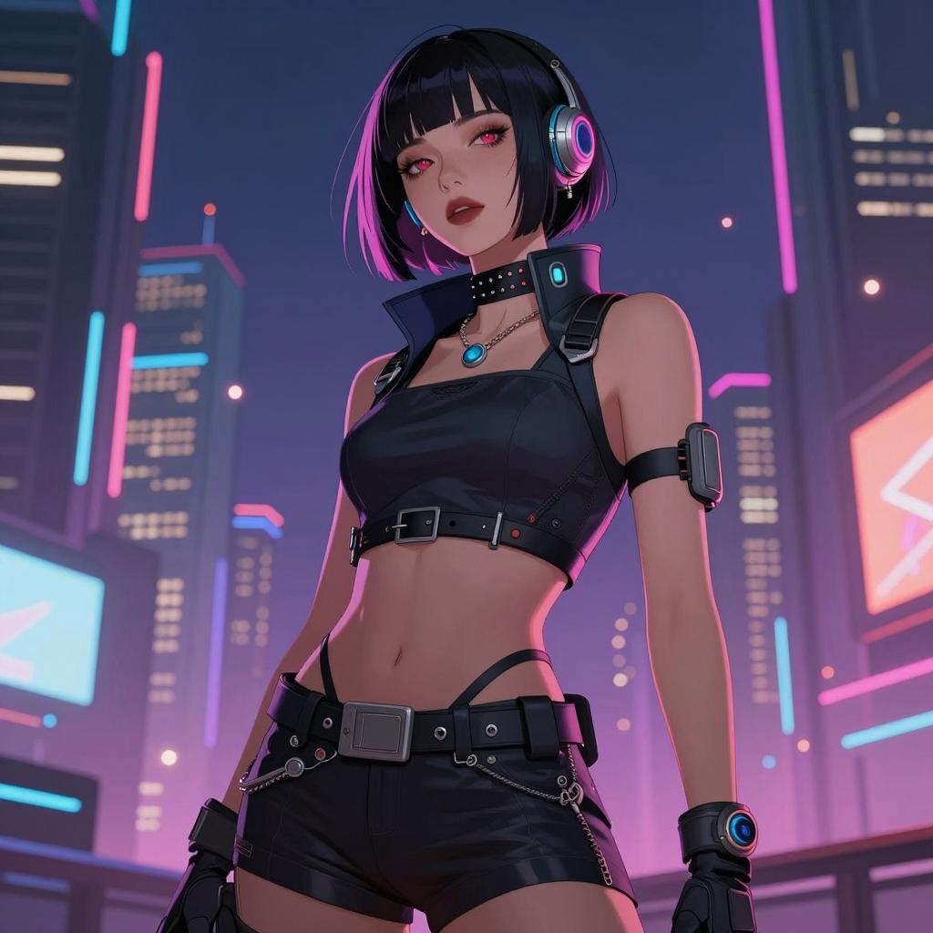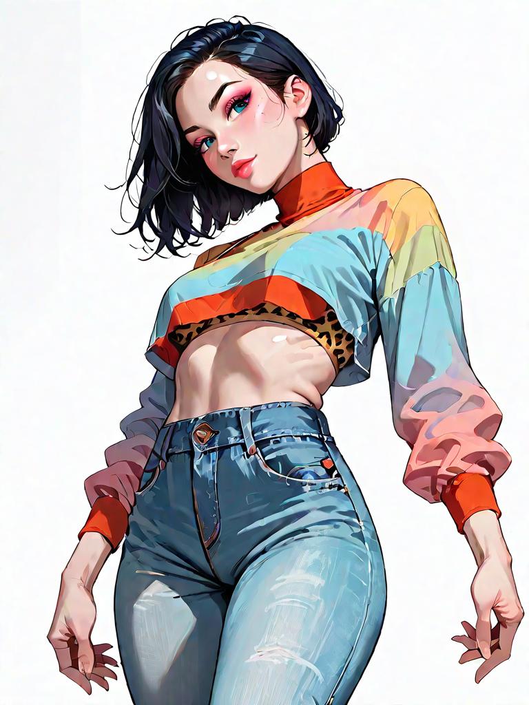 Digital illustration of a confident young woman with short black hair, striking blue eyes, and bold eyebrows wearing a blue crop top with orange straps and high-waisted pants. She accessorizes with large gold hoop earrings, a black choker, an armband with a digital device, and a utility belt. The colorful abstract background emphasizes a modern, futuristic, and adventurous theme.