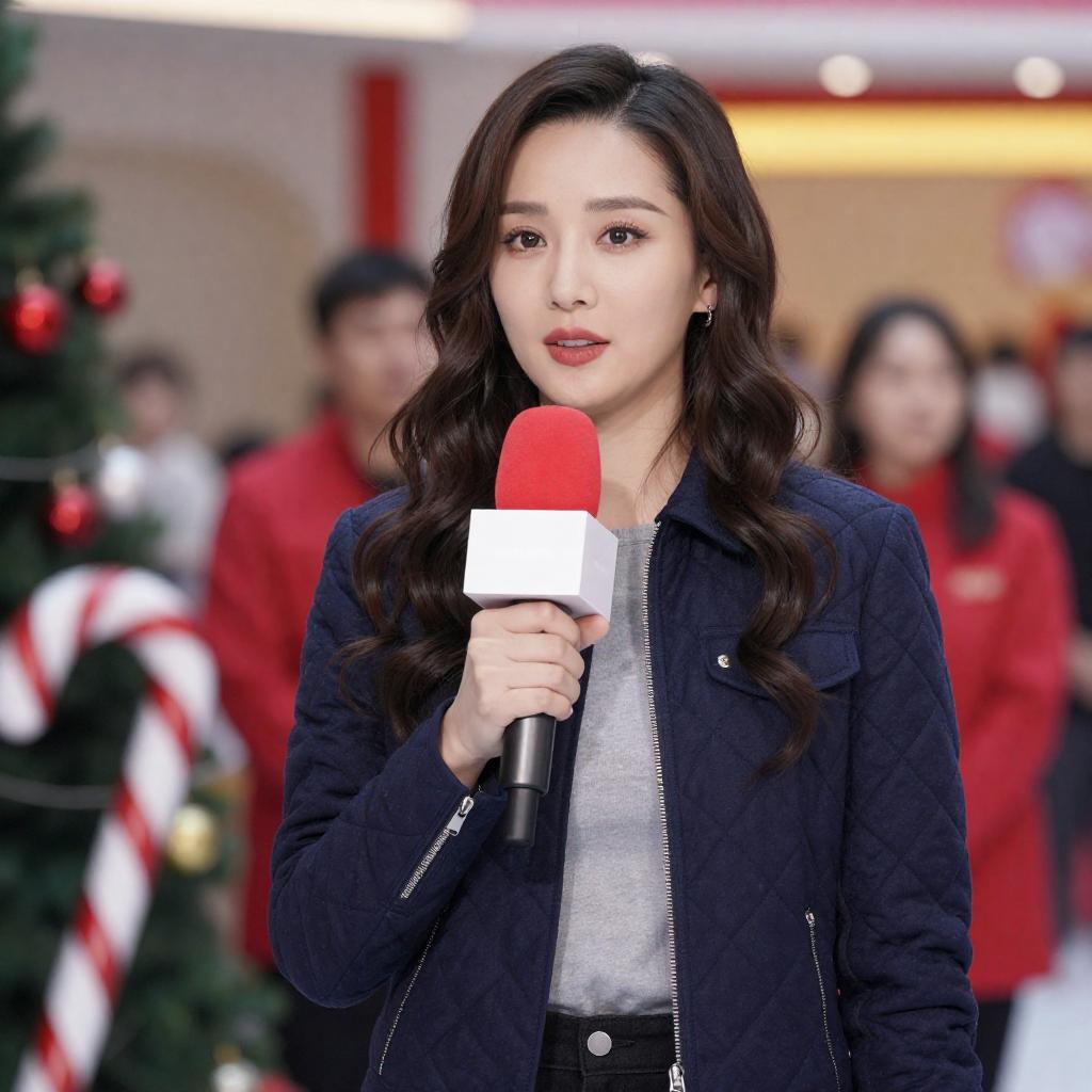 Photograph of a woman with wavy brown hair, wearing a dark blue jacket and jeans, holding a microphone, standing in a festive indoor setting with decorated Christmas trees, red and white striped cushions, and blurred camera in the foreground. Several men in dark clothing stand in the background.