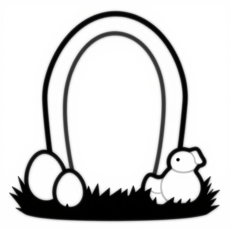 This is a black and white digital drawing featuring a simple, minimalist design. At the center is a large, oval-shaped tombstone outlined in thick black lines. In front of the tombstone, on a patch of black grass, are three white objects: two eggs on the left and a small duck on the right. The eggs and duck are also outlined in black, adding to the stark contrast. The overall style is cartoonish and clean, with a focus on bold lines and shapes. The background is plain white, emphasizing the central elements.