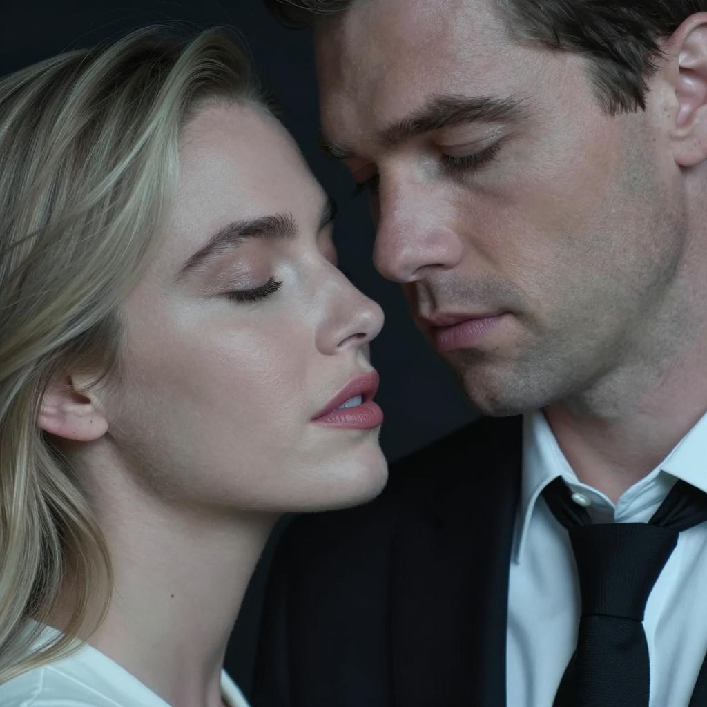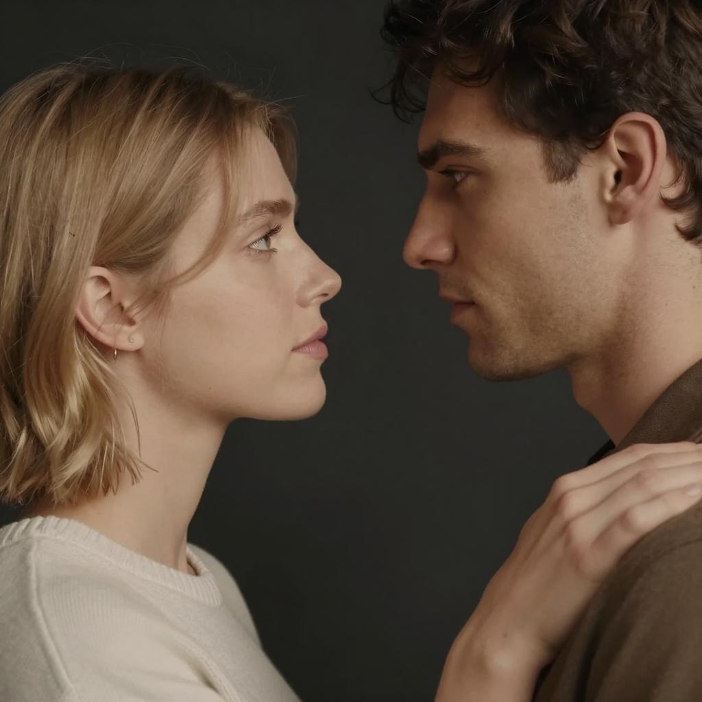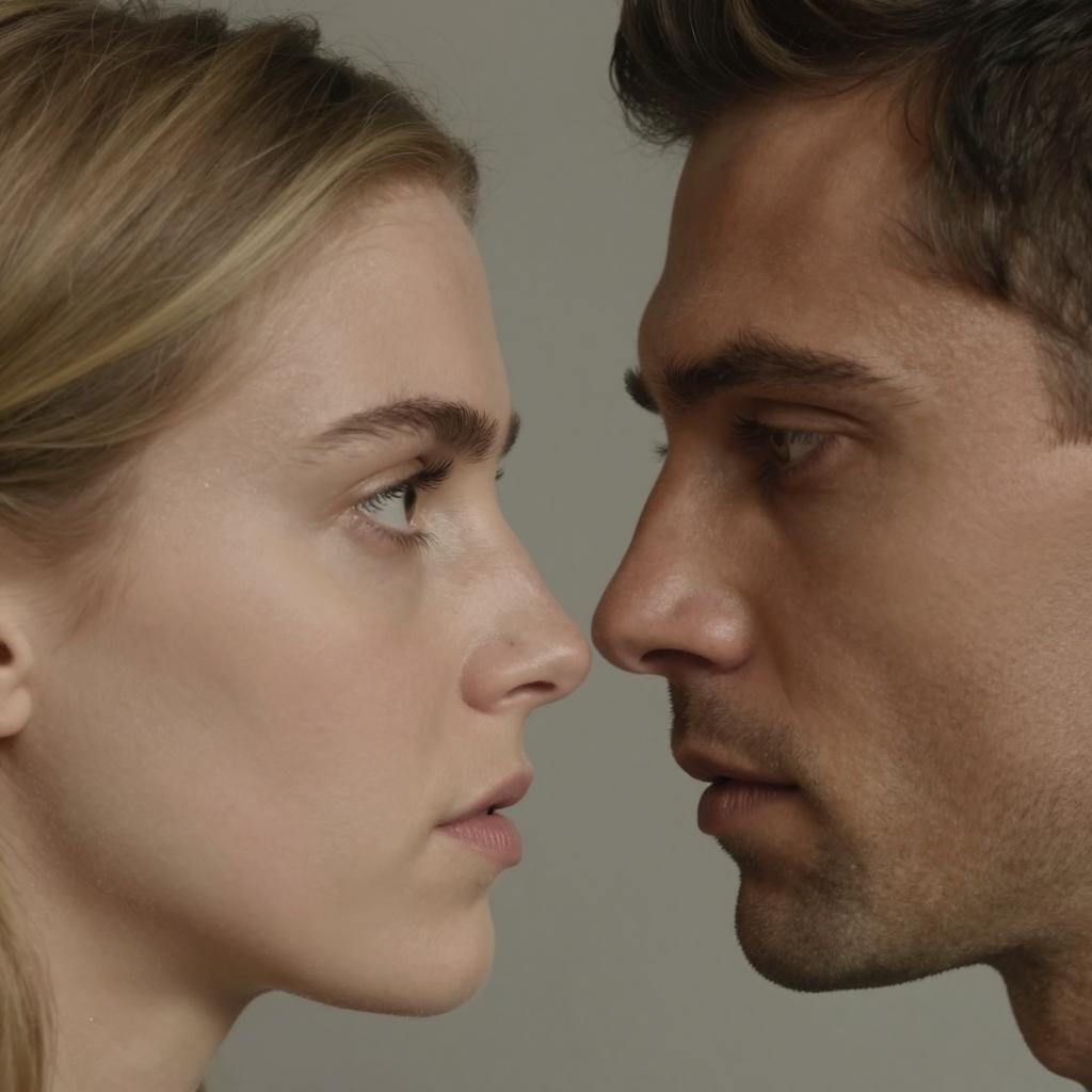 Close-up photograph of a man and woman with intense expressions. Their faces are closely framed, partially shadowed. Woman has blonde hair, fair skin, and dark eyebrows. Man has short brown hair, tanned skin, and dark eyebrows. They are positioned side by side, eyes locked, with shadows creating a dramatic effect.