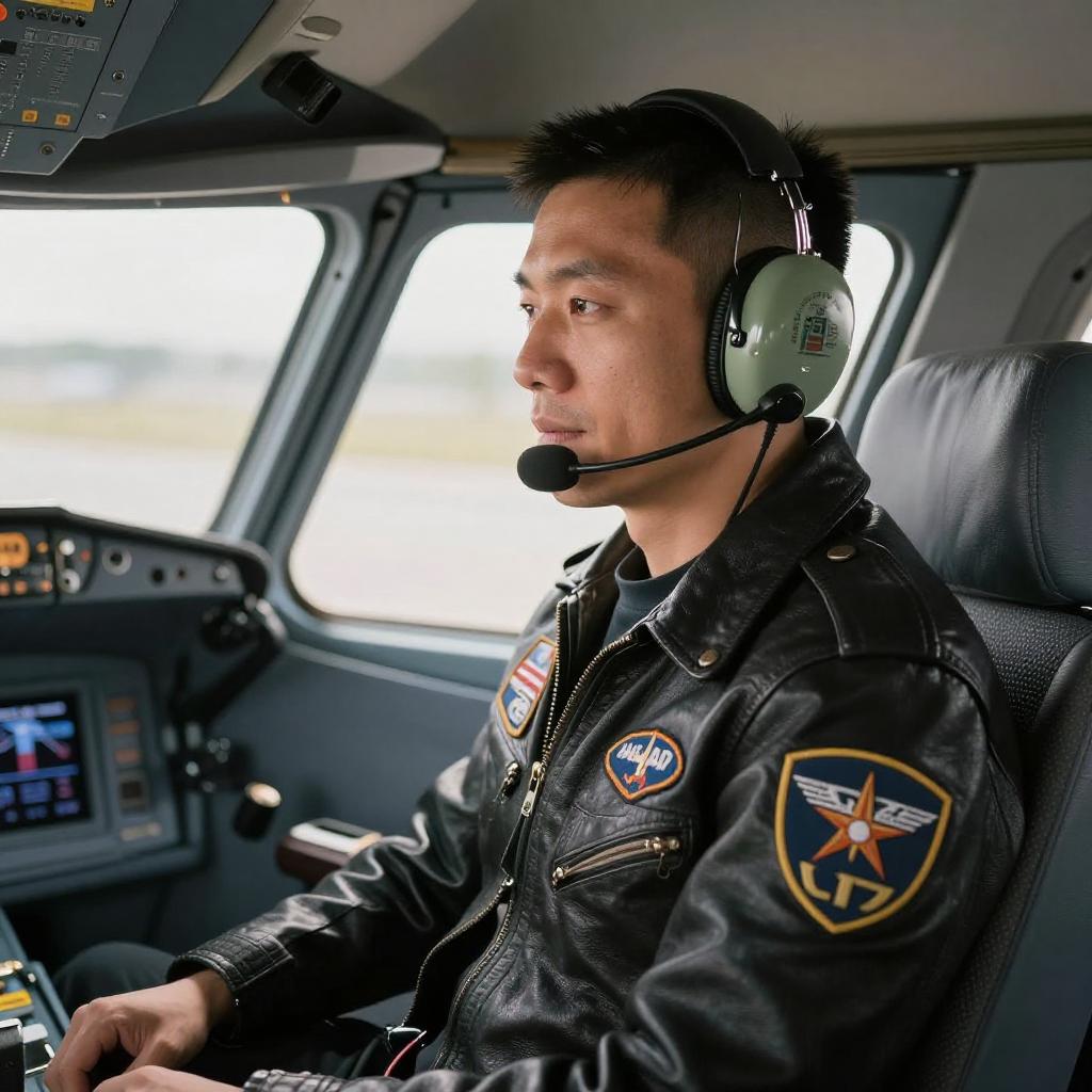 Portrait of a focused male pilot wearing a black leather jacket with various aviation patches and a communication headset, seated inside an aircraft cockpit with blurred windows in the background.