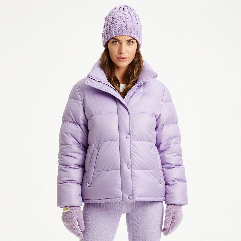 Photograph of a young woman standing against a white background. She has light skin, brown eyes, and straight brown hair peeking out from under a white, knitted beanie. She wears a light purple, puffy winter jacket with a high collar and large buttons, paired with matching light purple, textured leggings. She also has white, knitted gloves on her hands. Her expression is neutral, and she stands with her hands at her sides. The overall look is cozy and winter-ready, with a monochromatic purple and white color scheme. The image has a bright, clean, and slightly overexposed look.