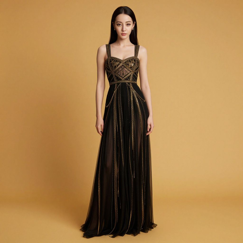 Photograph of an Asian woman with long black hair standing against a solid yellow background. She is wearing an elegant, floor-length black gown with intricate gold beadwork on the bodice and a sheer, flowing skirt adorned with vertical gold stripes. The dress has thin straps and a fitted waist, accentuating her slender figure. She stands with a relaxed, composed posture, looking directly at the camera with a neutral expression. The lighting is even, highlighting the textures and details of the gown.